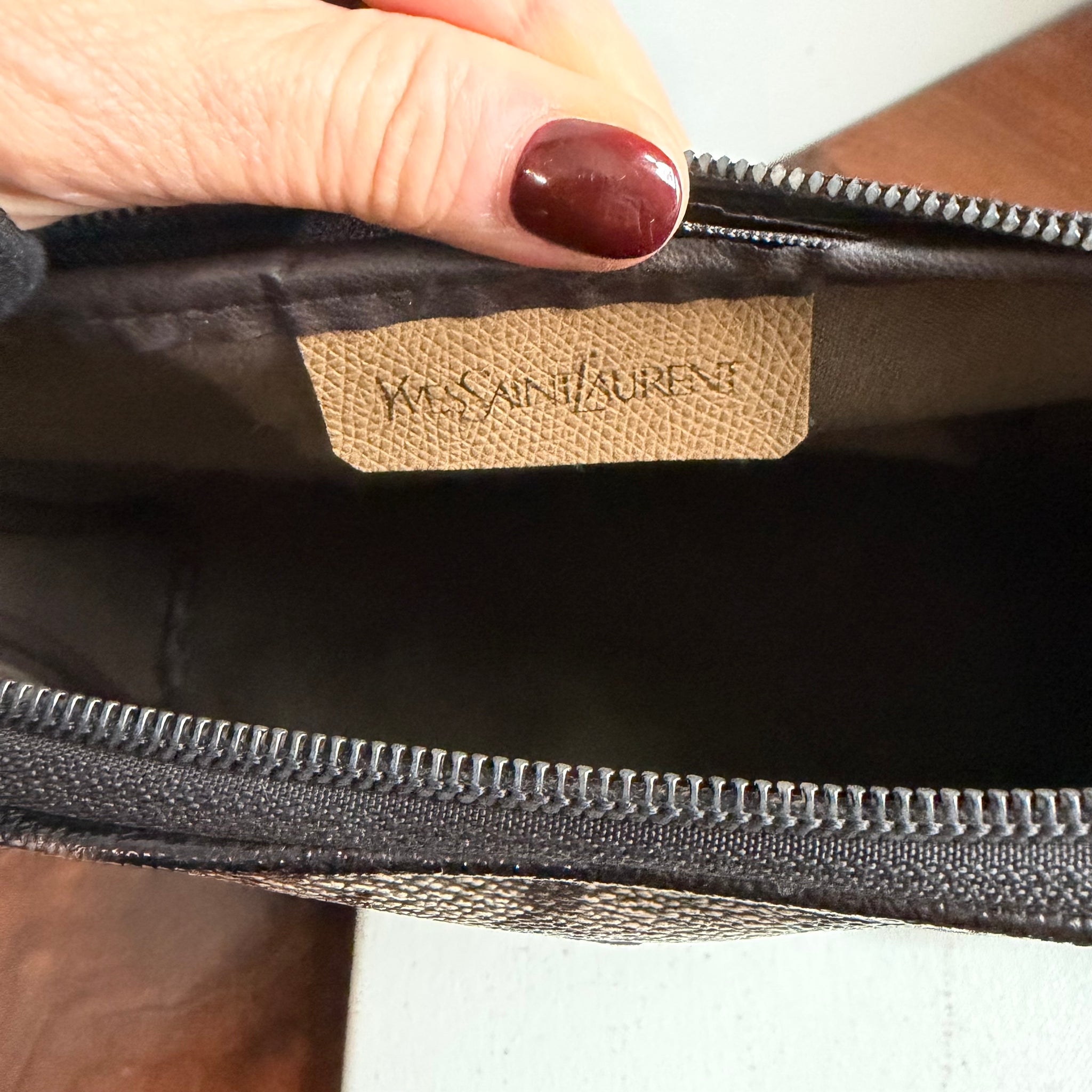 What a beautiful YSL bag!! This bag originally was a clutch and had taupe leather (see last pic), and it didn't do anything for me. So, I've dyed all the leather black, making that abstract giraffe print really stand out!!! And, now she's a functional crossbody...I love how she looks now!