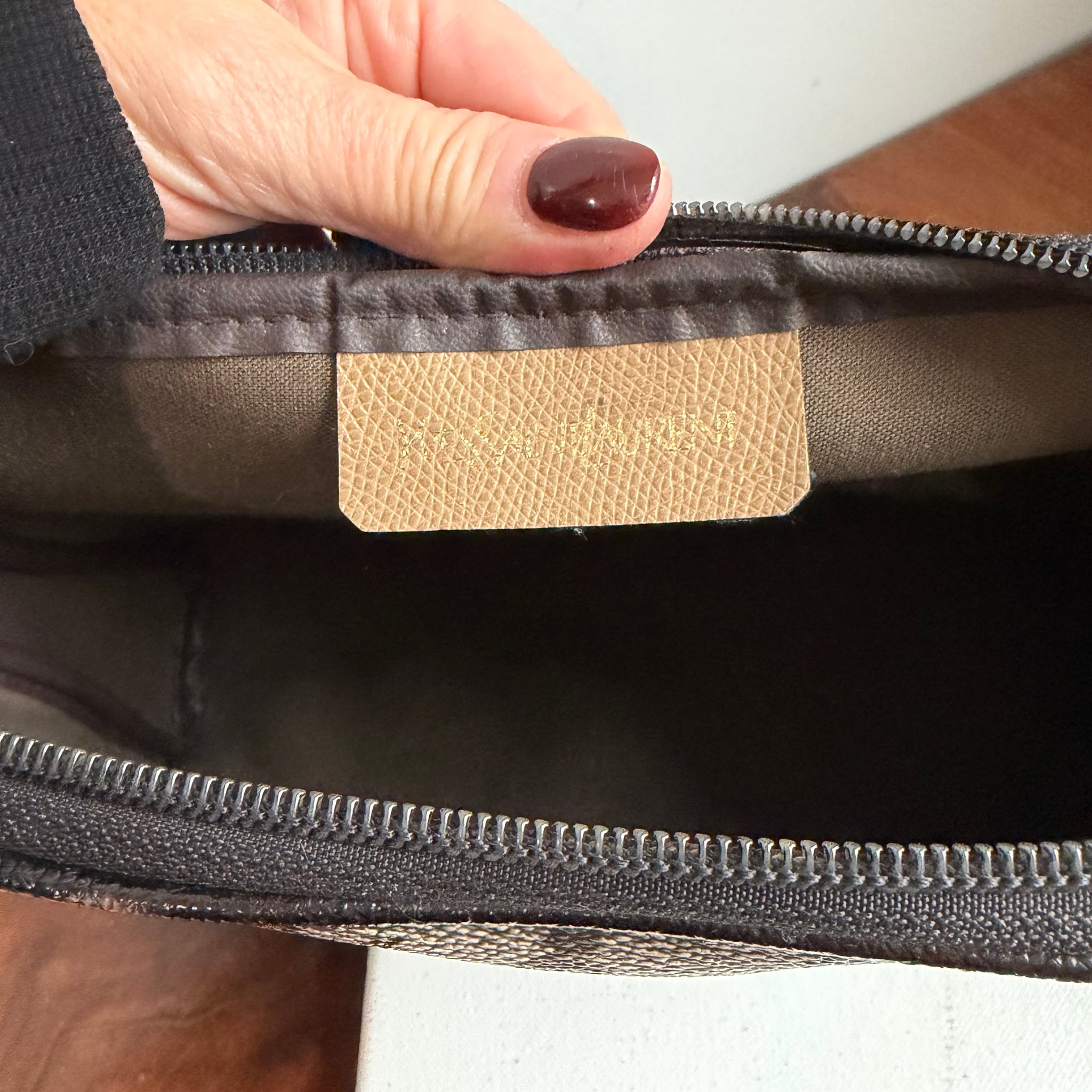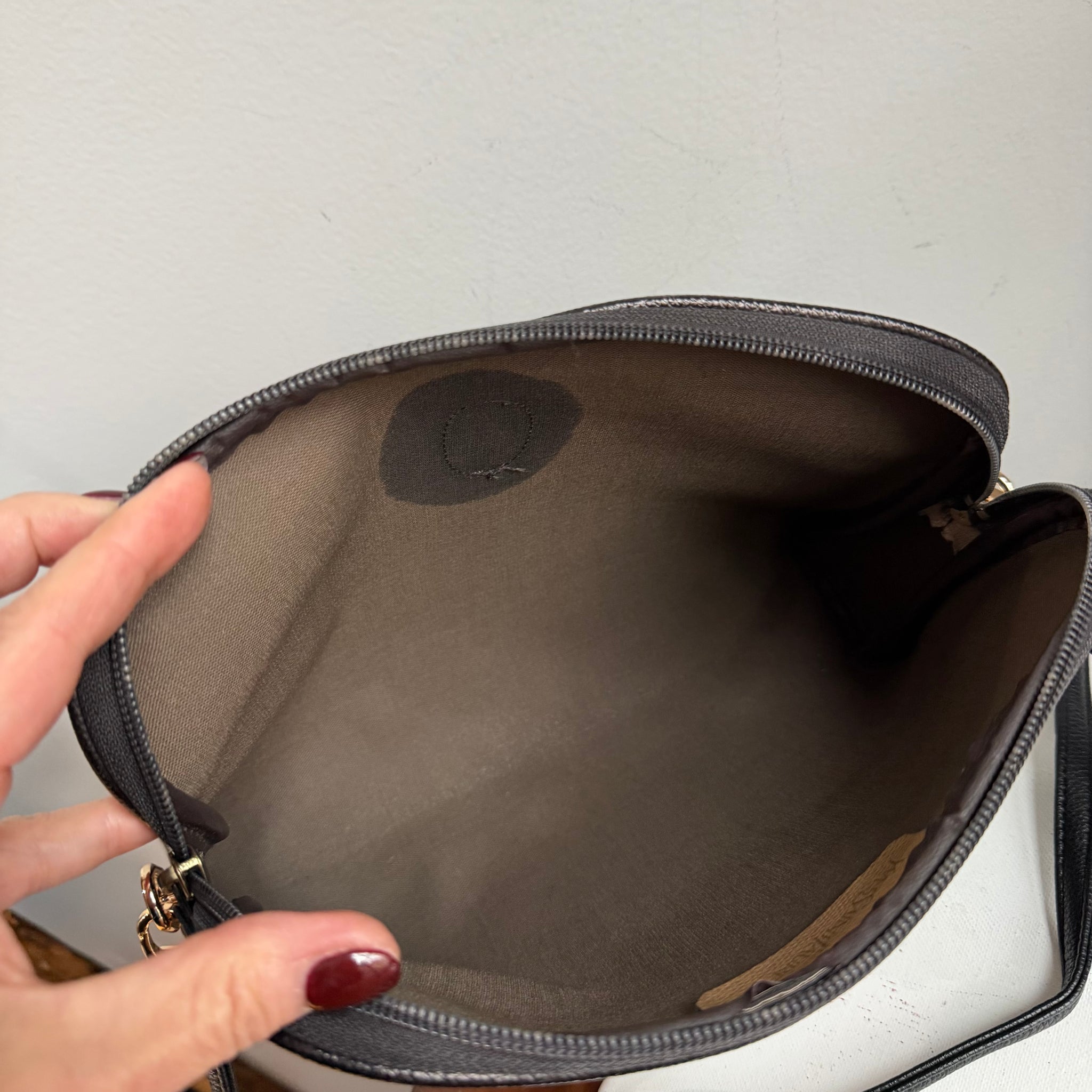 This bag has been fully cleaned inside an out. There is one compartment inside that is bare canvas. The exterior coated canvas and leather looks great. The zipper works perfectly. I've added brass D-rings to the sides of the bag to hold the black leather strap that is 41” long. This is a medium sized roomy bag that comes in at W10.5 x H7.5 x D2.5".
