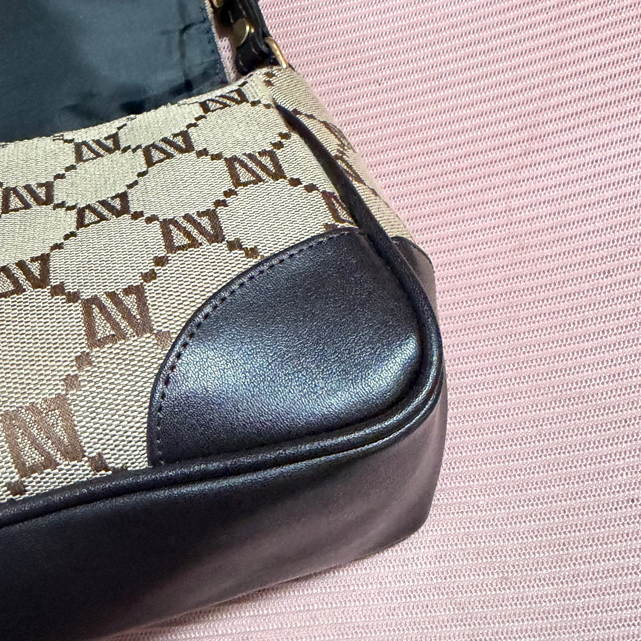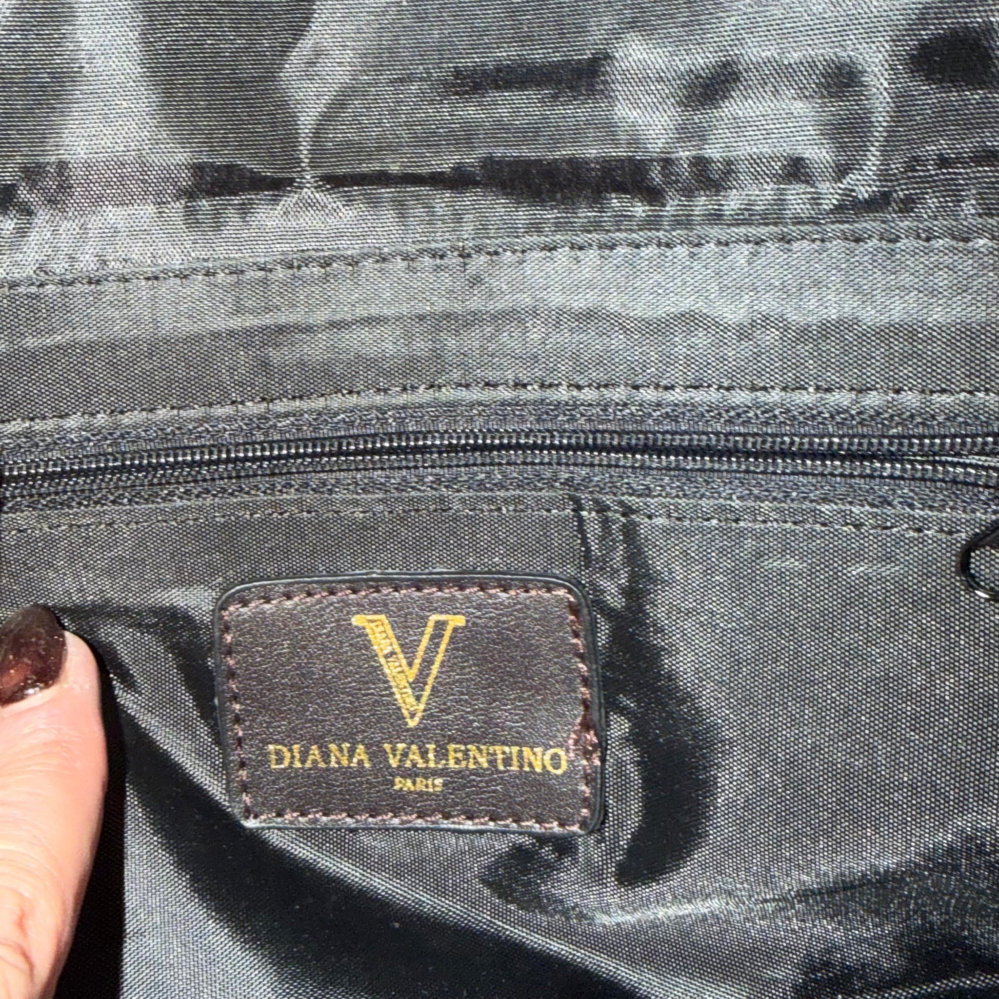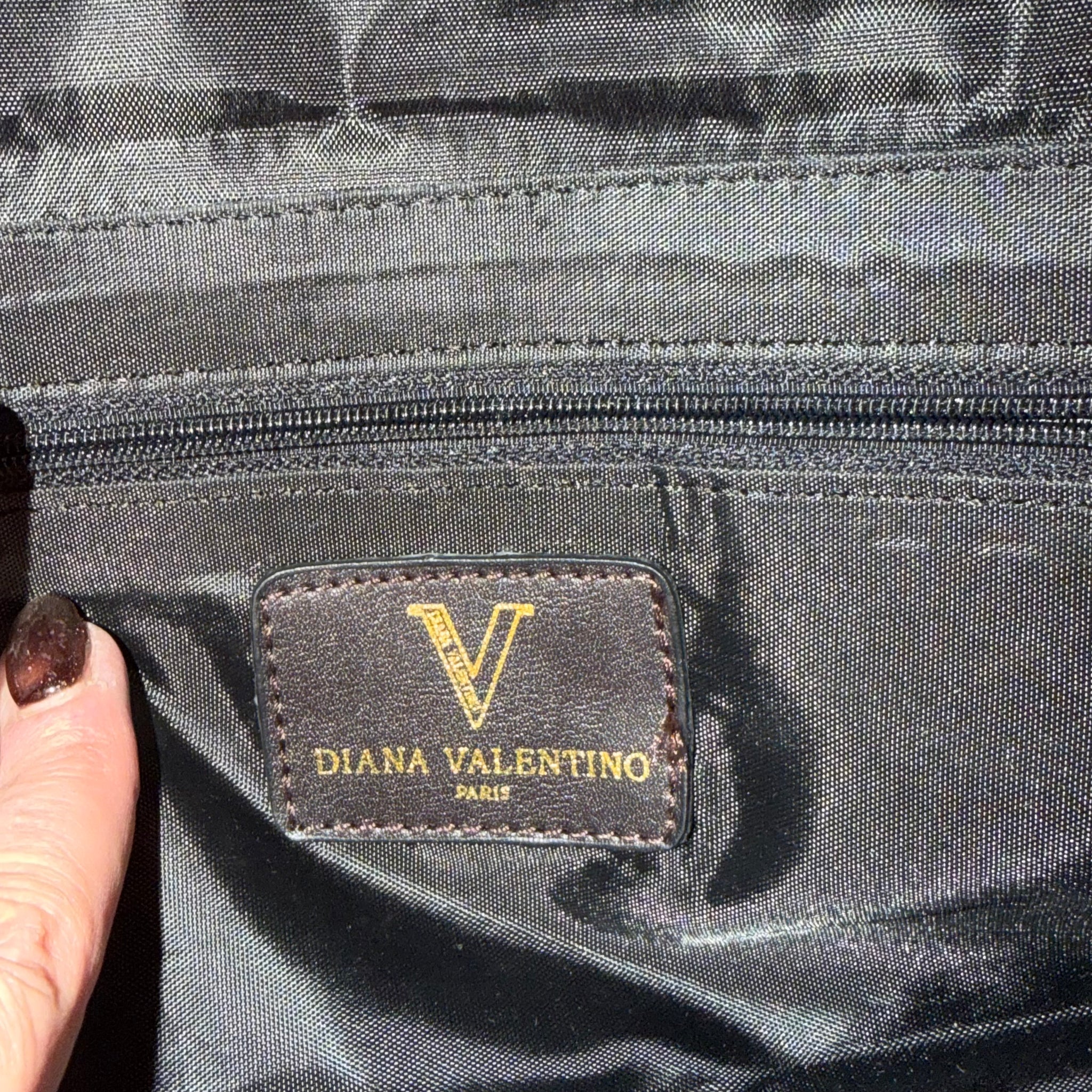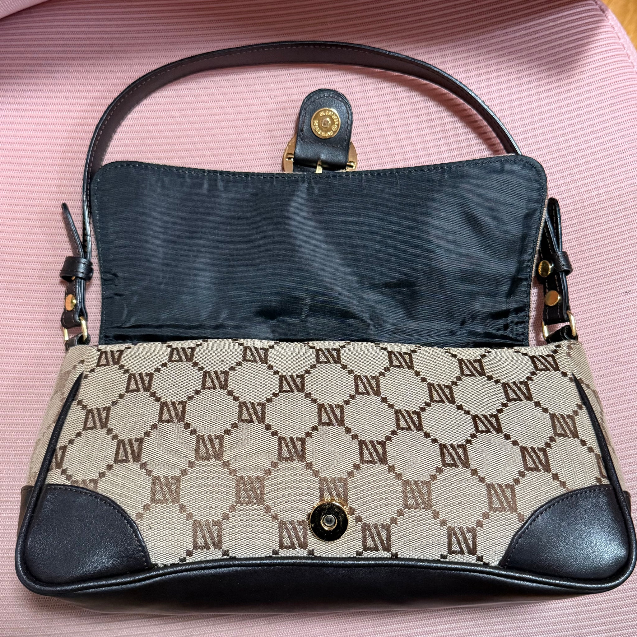 This bag still has the tags inside!  It's in great shape, as you can see.  This is a beautiful chocolate brown leather with the DV monogram on the outside canvas. The bag has a fold-over flap with gold hardware covering a magnetic snap. I don't see any scratches on the leather. The interior is roomy and clean and has a zippered pocket. The strap drop length is about 8", which allows this to be carried beautifully over your shoulder or your arm. This bag is L 11 x W 6 x D 3.5" and will fit lots of things!