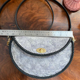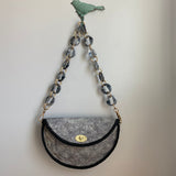 I cut the original bag apart and created this half round style that is so on-trend!!! I've hand stitched the black leather lace around the edges. The front flap interior is lined with a thicker black embossed leather to give it some substance. The front piece is lined with a silver leather. I've used a brass twist lock that gives the bag a fun twist. This bag has got enough room for just the right amount of things, coming in at W10.5 x H6.75 x D1.5".